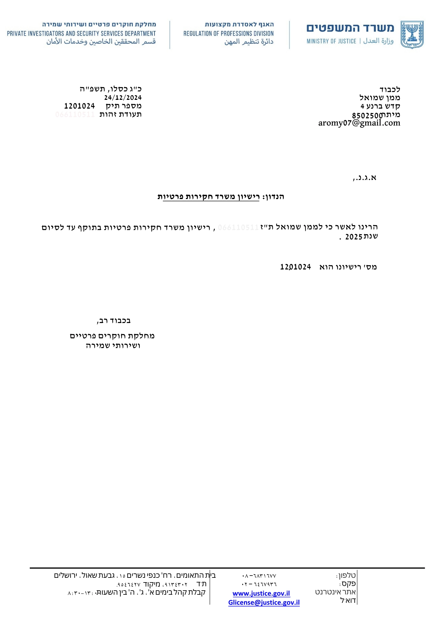 חוקר פרטי בעל רשיון של משרד המשפטים